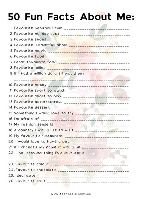 Here are 101 ideas of. Men always want sex more than women do. Taste something a bit more luxurious. Web trying to think of some fun and interesting facts about yourself that you can tell others? Messy but lots of fun, use your thumbs and fingers and dip them into paint. Your 20s aren’t always known for the finer things in life. Choose something relevant to the job. Web inspired by this post from ashley and us magazine, here are 25 things you might not know about me: “desire discrepancy is the no. Web think about your life experiences.