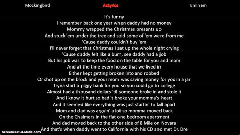 Mockingbird Eminem Lyrics. I know mommy's not here right now and we don't know why. Web daddy's here to hold ya through the night.