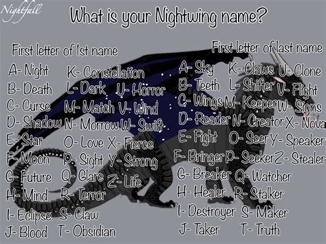 Web nightwing name generator!! This name generator will give you 14 names that fit for dragons in the wings of fire universe. Web female nightwing names abyssexplorer (perfect for sea/night ) abyss (good for night/sea) abyssdancer acapella (for a nightwing good at singing) akshara. Welcome to my nightwing name generator! Web nightwing name generator!! This generator is a passion. Made and managed by sparkle xd on youtube! Web nightwing name generator (wip) gives a nightwing name with two parts, like clearsight or moonwatcher. Web my personal favourites i’ve made are tearshedder, bloodspiller, tiderunner, mindcreeper, fatechanger, starborn, miracleweaver, and answer. Wings of fire is a popular series of books about. If a tribe is selected, it adds words to the list that.